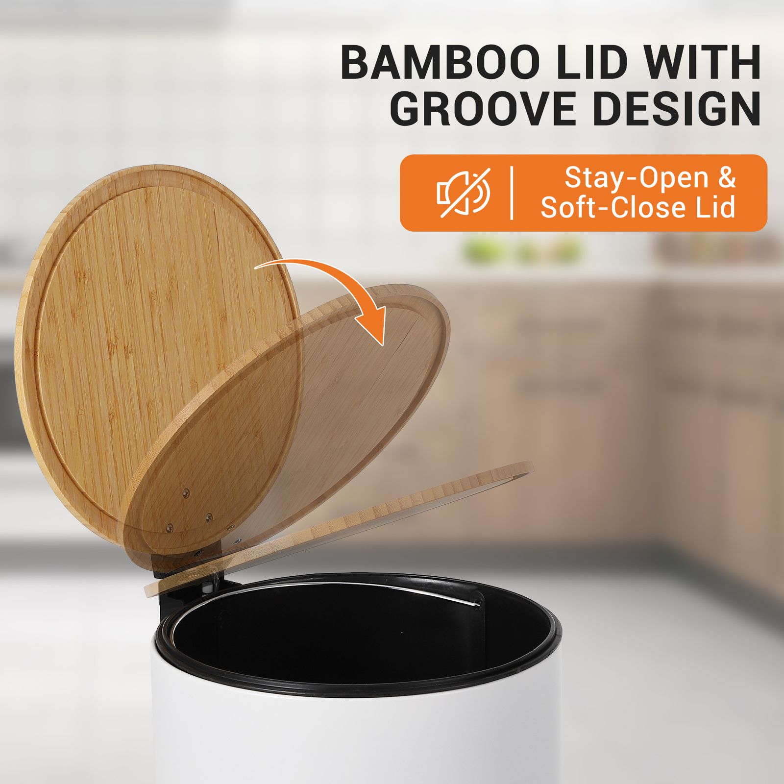 GarveeHome 8 Gallon Step Trash Can with Soft-Close Bamboo Lid, Stainless Steel Garbage Can with Removable Inner Bucket, 30L Round Trash Bin, Perfect for Kitchen, Bathroom, Living Room, White